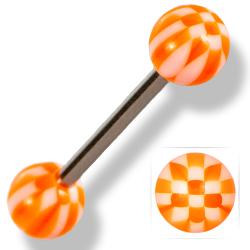 Nyelvékszer orvosi acél szárral, fehér- narancssárga pepita mintás acryl golyókkal.