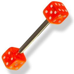 Narancssárga dobókocka végű nyelvékszer, orvosi fém szárral.