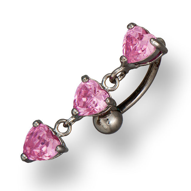 Orvosi acél, fordított köldök piercing, lelógó rózsaszín szívekkel.